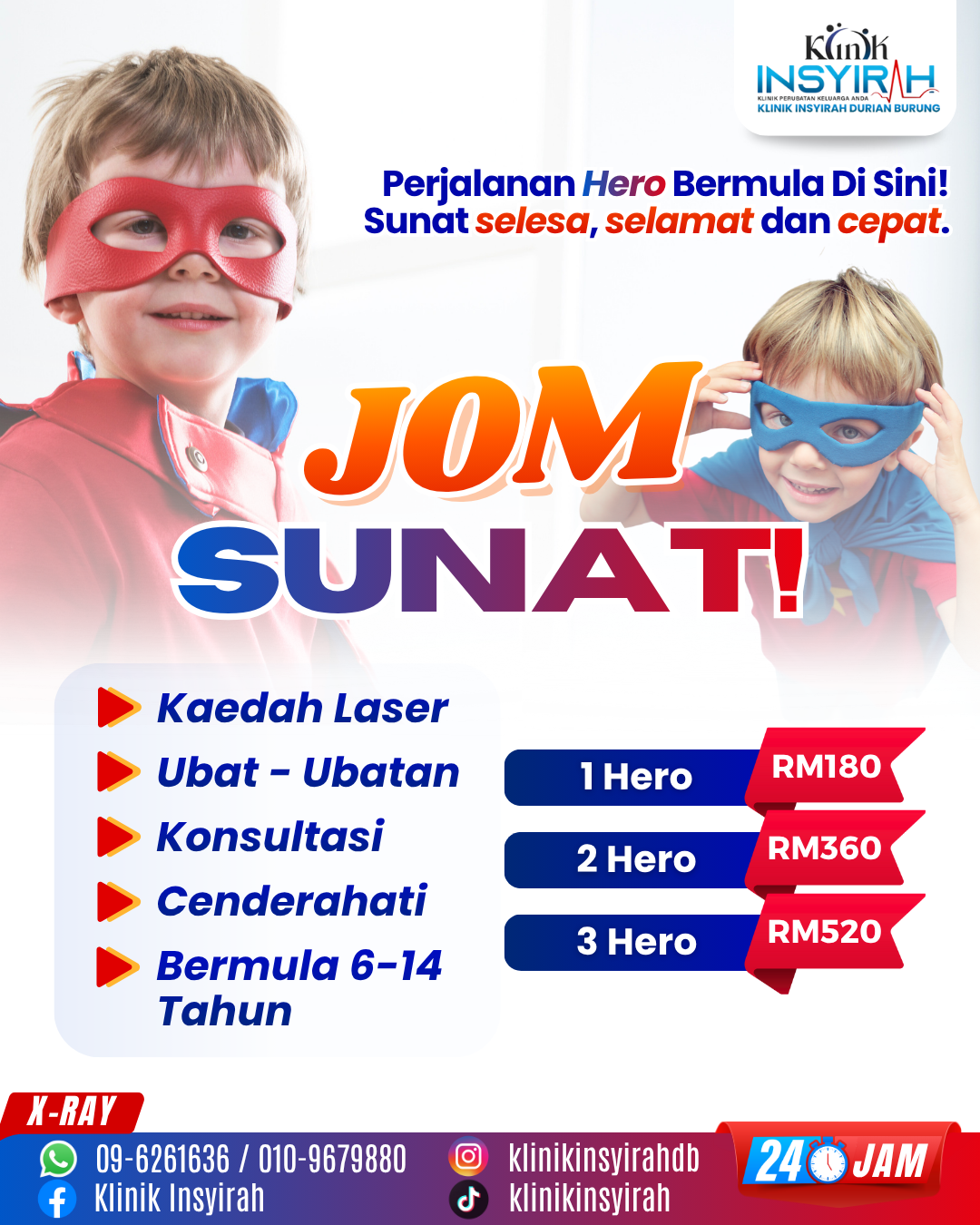 Prosedur sunat dilakukan oleh doktor berpengalaman menggunakan kaedah moden yang lebih cepat, selamat dan minimun rasa sakit. Persekitaran mesra kanak-kanak membantu anak kekal tenang sepanjang proses. Penyembuhan lebih teratur, penjagaan selepas rawatan yang jelas, serta pemantauan profesional untuk memastikan pengalaman sunat yang selesa dan meyakinkan untuk ibu bapa dan anak.
